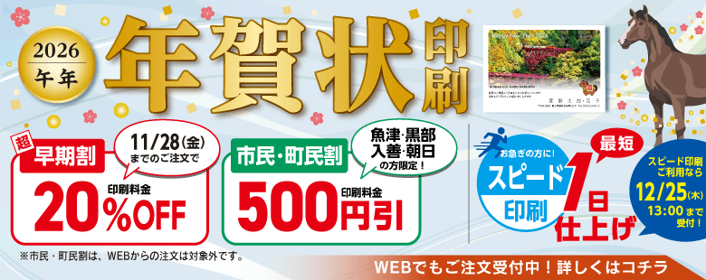 ◎ご来社頂いた魚津市・黒部市・入善町・朝日町の方は「市民・町民割」として印刷代500円引き!
